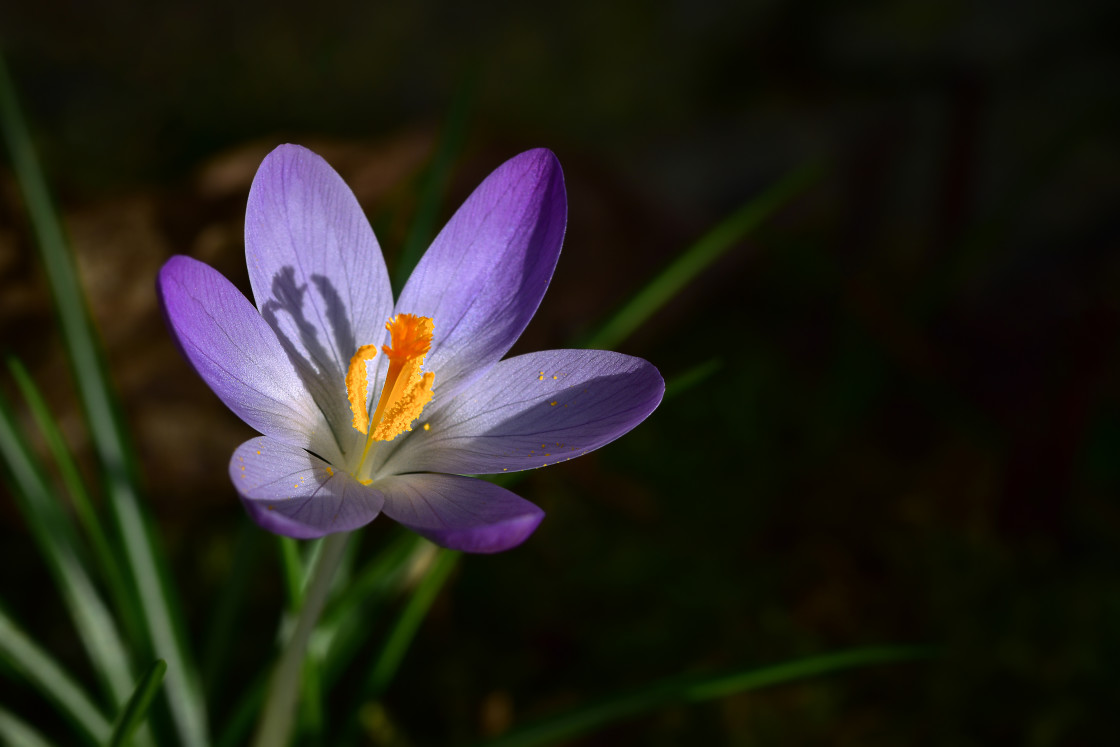 Blooming violet purple crocus flower close up with copy space, shallow depth of field macro nature photography