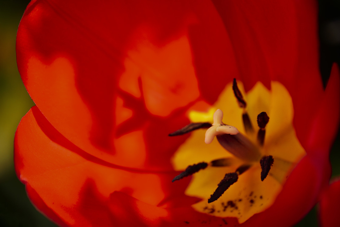 Stamens and petals of flowering red tulip (Tulipa) typical of Holland, close up macro, nature photography shallow depth of field