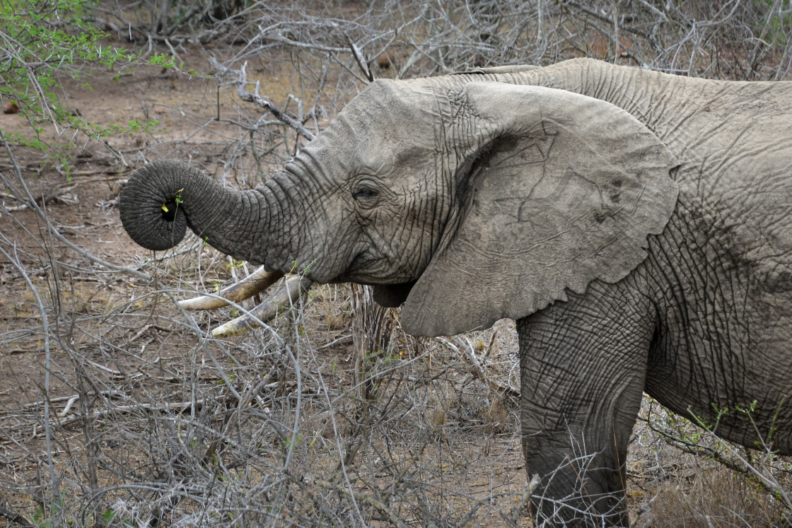 Elephant in African bush with curling trunk and two tusks, Loxodonta africana, wildlife in South Africa