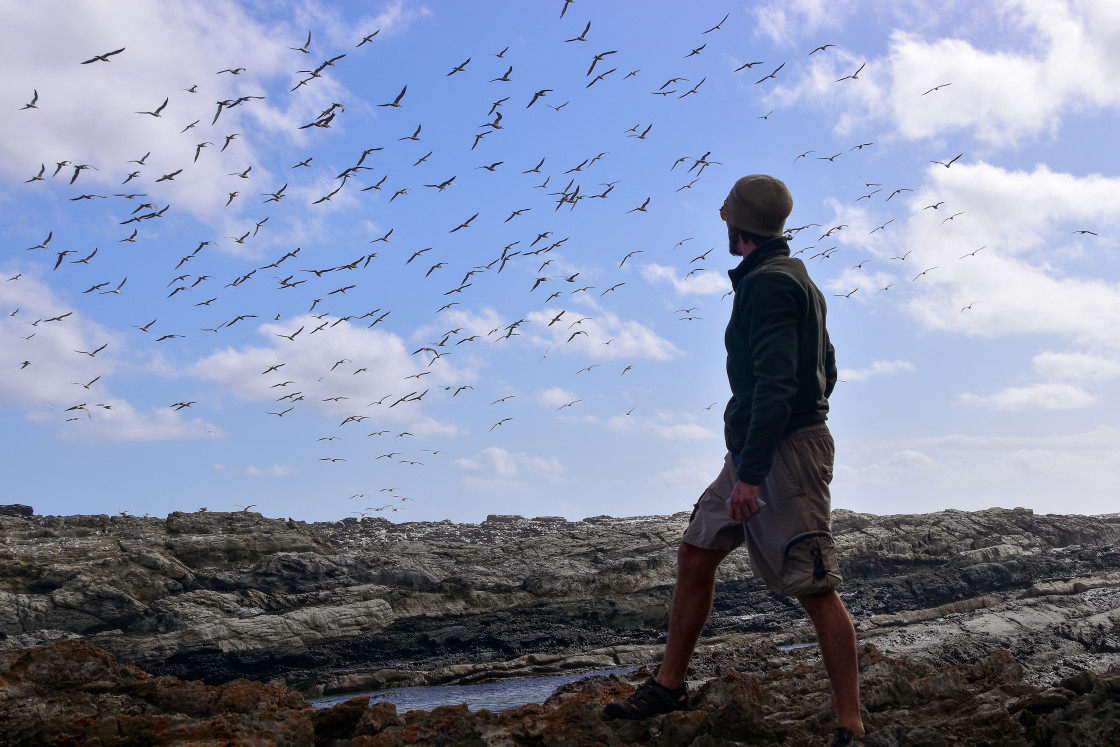 Man watching a flock of seagulls flying at the coast of Tsitsikamma National Park, Garden Route South Africa