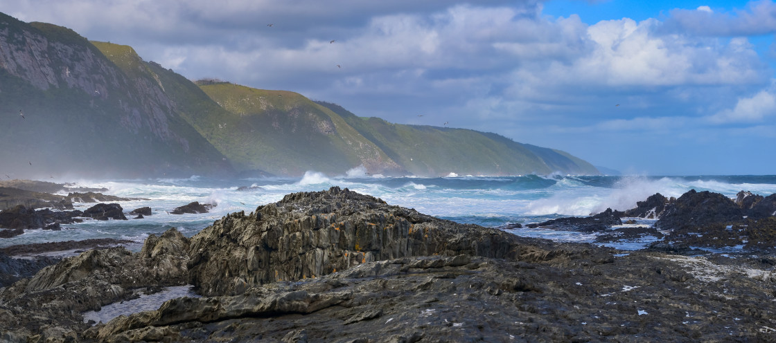 Rough rocky coast, wild sea and green mountains, panorama landscape Tsitsikamma National Park Garden Route South Africa