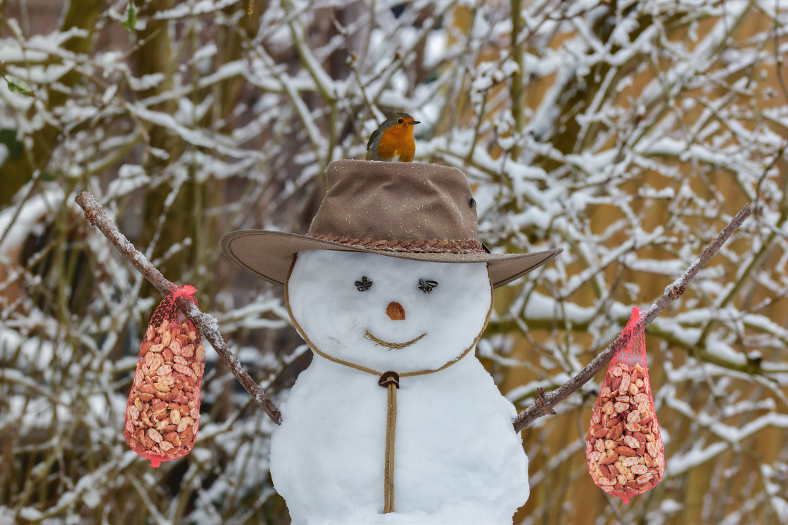 Snowman bird feeder with European robin (Erithacus rubecula) on cowboy hat in winter forest